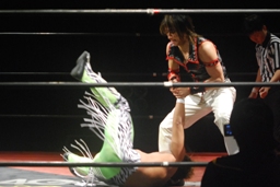 凛音コーナーに上って真空美日月斬り(右写真)、カウント2。