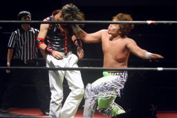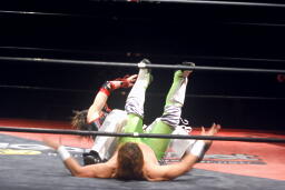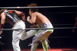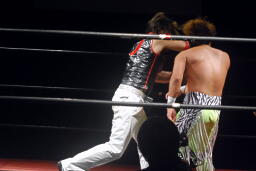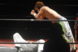 対角線コーナーのターンバックルにぶつけ、セカンドコーナーからのミサイルキック(右写真)、カウント2。