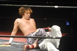 翔太ストンピング、フォアアームドロップ(左写真)、カウント2。