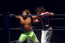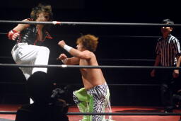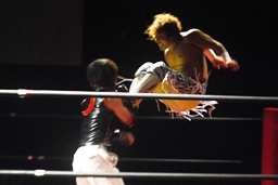 張り手の打ち合い、凛音エルボー3連打。翔太パンチ、ロープに飛ぶ、凛音ドロップキック(左写真)。
