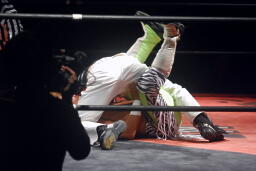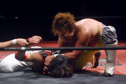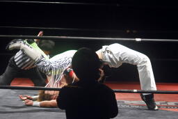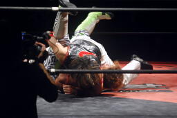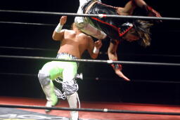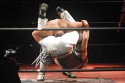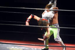 翔太ロープに飛ぶ、凛音リープフロッグでかわすが翔太は着地するところを捕まえてフライングメイヤー(右写真)。絞り上げてカバー2回、いずれもカウント2。