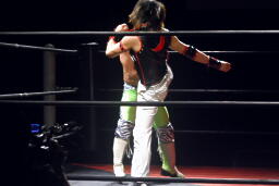 凛音ロープに飛ぶ、翔太ラリアット、凛音かわしてコルバタ(左写真)。