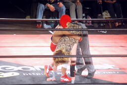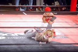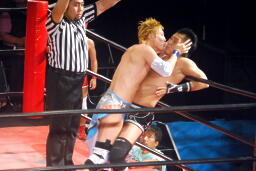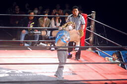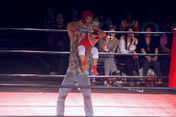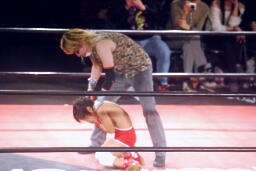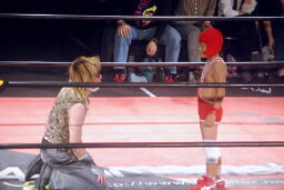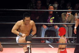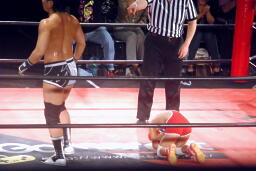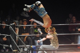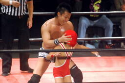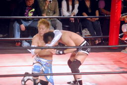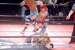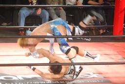 6号ロープに飛ぶ、ニラ6号を止める(右写真)。「なんだこの接待プロレスは!DDTが名古屋のプロレス界との関係を強固にするために、なんで俺が駆り出されなきゃいけないんだ?」