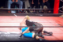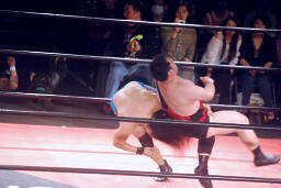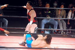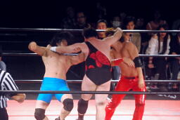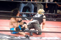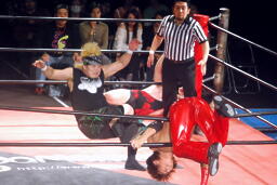先発はウラノと彰人。ロックアップからウラノが押し倒し(右写真)ケサ固めに、彰人はエビ固めにカウント入らず。