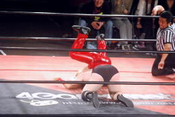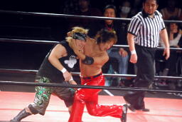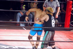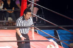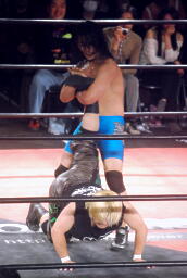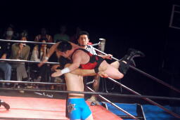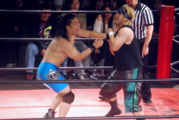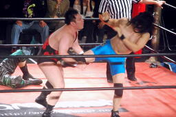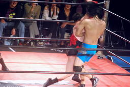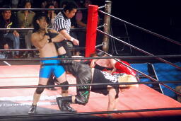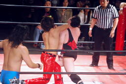 ウラノは松井レフェリーをフェイントに使って延髄蹴り、高尾かわしてバックスタバー(右写真)。彰人にタッチ。10分経過。