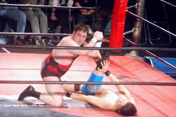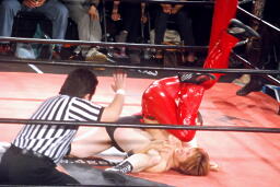 アントン高尾を十字架固めで押さえ込む(左写真)、カウント2。