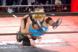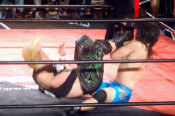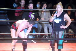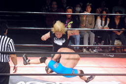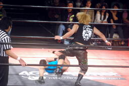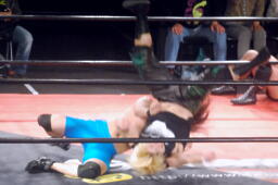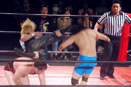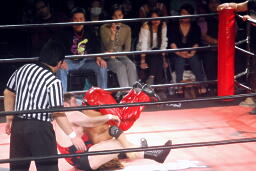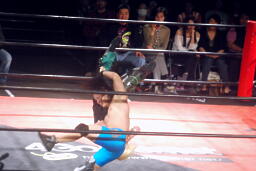 彰人低空ドロップキック連打、ウラノはカウント19で戻る。