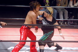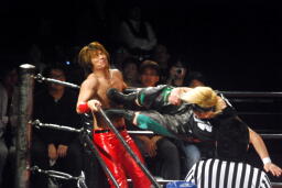 ウラノもエルボー(左写真)。高尾が打ち勝ち彰人にタッチ。5分経過。