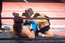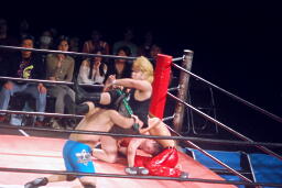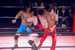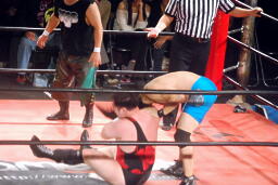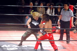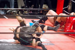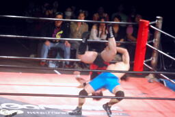 彰人下から足を取る(右写真)、アントンは極められる前にロープエスケープ。ウラノが「いいよいいよ!」と大声でアドバイス。彰人は高尾にタッチ。