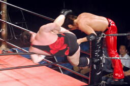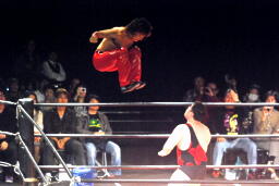 アントンがコーナーに上り彰人にクロスボディ(右写真)。