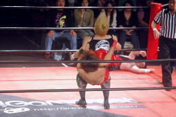 高尾コーナーに振って串刺しエルボー、反動を付けてストンピング、カウント1。コーナーに上ってミサイルキック(左写真)、カウント2。