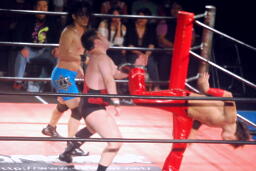 彰人リングイン、ダブルのクローズラインはアントンかわして2人にパンチ(左写真)、