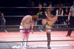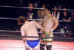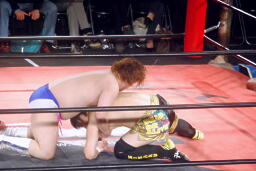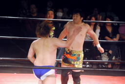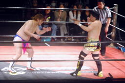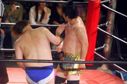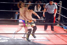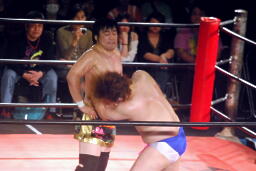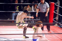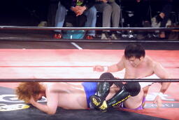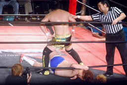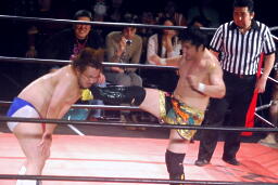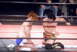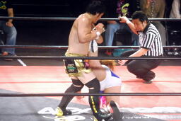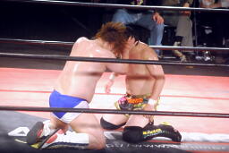 佐藤ローキック連打(左写真)。ロープに振ってバックエルボー、カウント2。