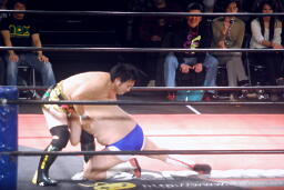 ディーノロープに飛ぶ、佐藤カウンターのミドルキック、カニばさみで倒してアキレス腱固め(右写真)。ディーノ「効いてない!」5分経過。