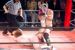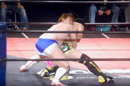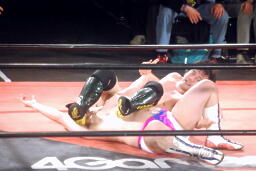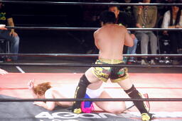 佐藤さらにローキックからアンクルホールド(右写真)、ディーノ首固めに、カウント2。