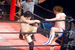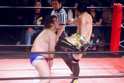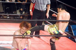 佐藤はディーノの足をロープに引っ掛けてローキック(左写真)。
