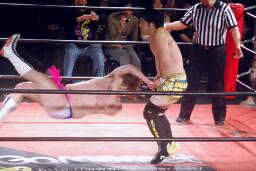 佐藤再度アキレス腱固め(右写真)、ディーノまたも耐える。