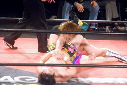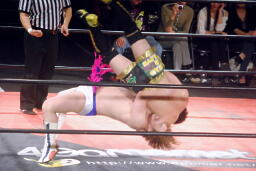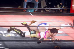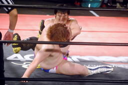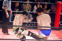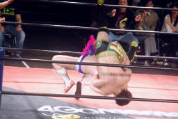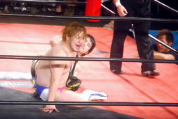 佐藤はコーナーに飛ぶことなく前転してヒザ十字から逆片エビ、ディーノロープ(右写真)。