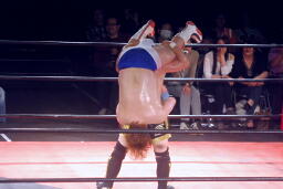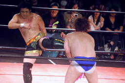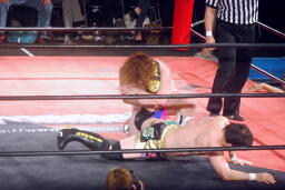 ディーノ足をキャッチして男色スクリュー(左写真)。ディーノバック取る、タイツに手を突っ込んだかと思うと立ち上がってストンピング。