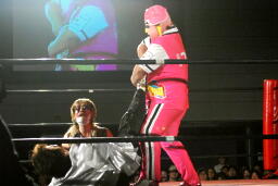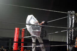 菊タローはヒザ靱帯損傷で負傷欠場となったくいしんぼう仮面をセコンドに従えてリングイン(右写真)。