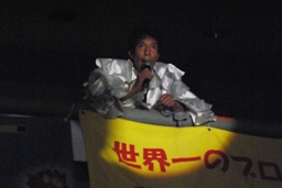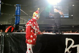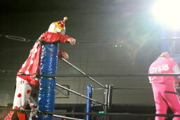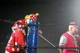 ゴングが鳴ると菊タローマイク「我々がポンコツでもできるプロレスを開発したというのに、今日こいつはそれすらもできない、というおとでおわびのあいさつしなさい。」(右写真)