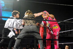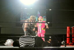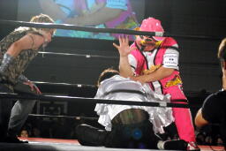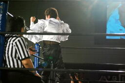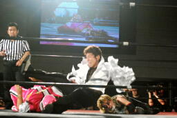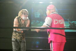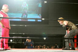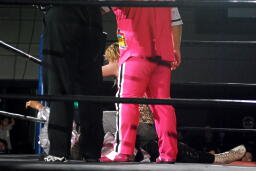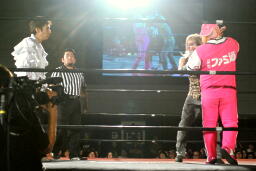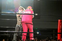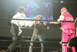 2人で松野に「お前はこのまま接待プロレスを続けてていいのか!お前は立ち上がるところをお客さんは見たいんじゃないのか!」などと檄を飛ばす(右写真)。