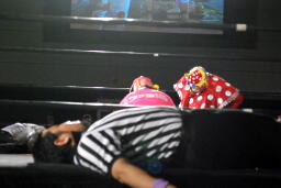 とりあえず転がしておく(右写真)。しかしレフェリー不在では悪いことはできても試合を終わらせることはできないと気付き、「お客様の中にレフェリーできる人はいませんかー?」