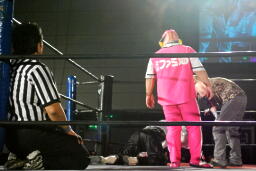 菊タローは松井レフェリーを手刀で失神させる(左写真)。
