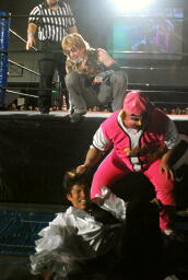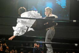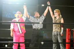 1番を歌い終わる頃にカウント20、2人がリングアウト勝ち、ということで松井レフェリーは2人の手を挙げる(左写真)