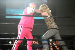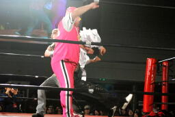 「君子危うきに近寄らず、や!」ということで松野を無視して2人でロックアップ(右写真)。ハンマーロックの攻防からヘッドロック、フライングメイヤー、ブレーク。