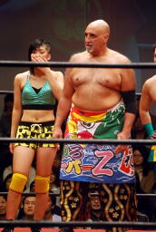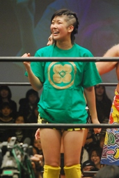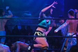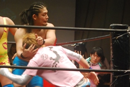 S.O.S.が大石をコーナーに上げてスパイラルX狙うが「ワニとシャンプー」が流れ踊りタイム(左写真)。すぐに止まり大石は長井をスリーパー、すると今度は「行くぜっ!怪盗少女」が流れ大石も技を解く羽目に。