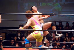 長井が飛香を場外に出す。平田が長井にエルボー、ロープに飛ぶ、長井ビッグブーツ(右写真)。