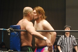 ディーノも参加して長井にキス(左写真)。5分経過。