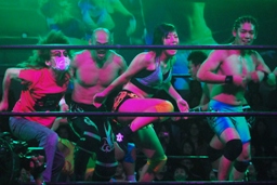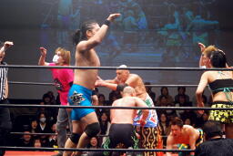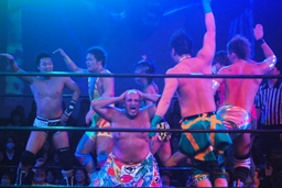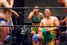 ここで「Chai Maxx」流れ、ダンスタイム。試合に失格した福田も踊る(右写真)。