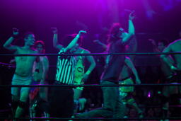 ディーノがオーディションの要項を発表(右写真)。10分時間制限のバトルロイヤルでフォールを取られたものは退場、しかし退場してもオーディション失格というわけではなくアピールする時間が短くなるというだけ。試合の途中ランダムに曲が流れるのでその時は試合を中断して踊りをアピールすること、というもの。