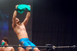 5人目のメンバーは彰人!選考理由は踊りと闘いのバランス。彰人は緑のTシャツを受け取るとコーナーに上ってビッグバンプ(右写真)。
