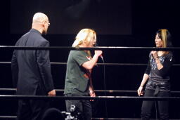 後半はユニオンからの告知でスタート。まずは紫雷美央がこないだ撮ったヤングユニオン用の水着写真をポスターカレンダーにして限定30枚1/3に発売。そしてロシアIWFのエージェントに就任したウラジミール長井が登場、12/14のルールを「オンリーギブアップ」にするよう要求(右写真)。美央は拒否するが大家の「やってやるよ!」で決定。