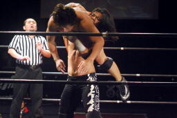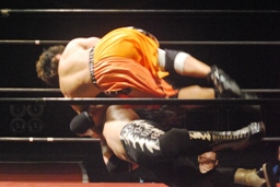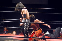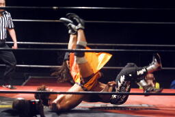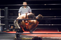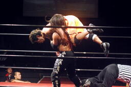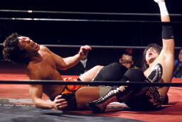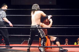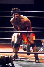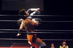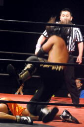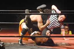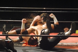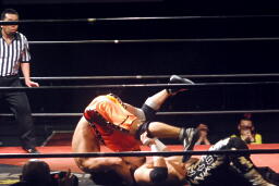 パンチの打ち合いから佐々木DDT、ケブラドーラ・コン・ヒーロ(右写真)、カウント2。