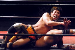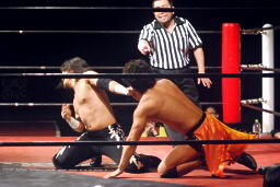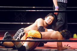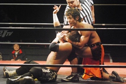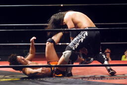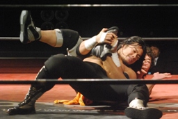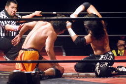 高梨ジャックナイフ、佐々木切り返してエビ固め(右写真)、カウント2。