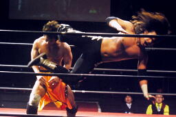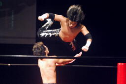 高梨ロープに振る、佐々木切り返してアームドラッグ。高梨鼻をつまんでチョップ、ロープに飛ぶ、佐々木カウンターのドロップキック(左写真)、高梨場外エスケープ。