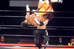 高梨スリーパー、佐々木はバックドロップに切り返す(右写真)。