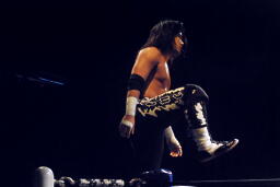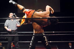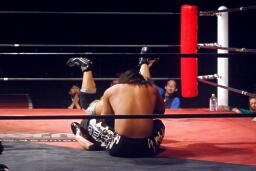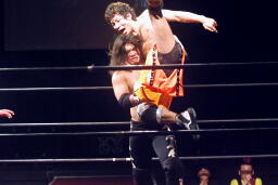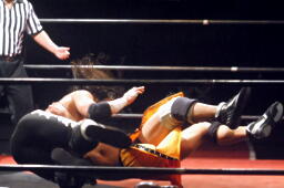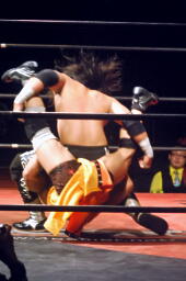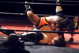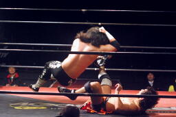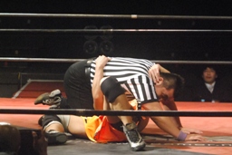 なかなかリングに上がってこない高梨に焦れて佐々木は場外に、高梨するとリングに戻る。佐々木がリングに戻ろうとロープをまたぐと高梨ロープを蹴り上げて急所攻撃、そしてイーヴンフローDDT(右写真)、カウント2。