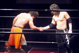 佐々木は高梨に「2人ならKO-Dタッグ獲れる」とタッグ結成要請、高梨は「KO-Dタッグ獲れるかはわからないけど、大ちゃんと組めば業界の甘い汁を吸い尽くせるような気がする」と承諾、2人握手(左写真)。KO-Dタッグについては次の挑戦者まで決まっていることからGMが保留。面白いタッグの誕生だ。