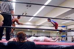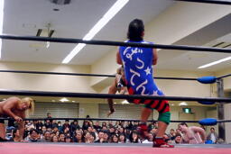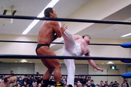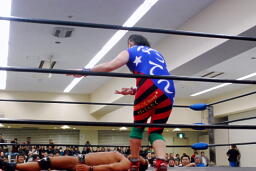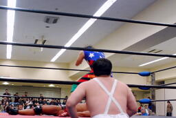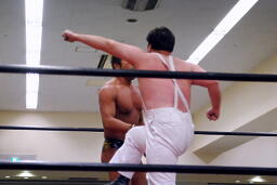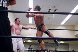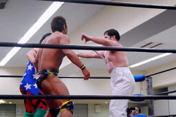 YAZAWAがマイケルをロープに振る、ばってんも大家をロープに振るが(右写真)切り返される。