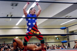 A.YAZAWA入場(左写真)。客席から「アントンじゃん。」という声が。ユニオンの東京大会でしかやってないから知られてなかったか。