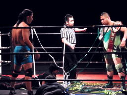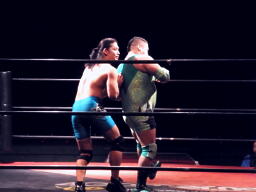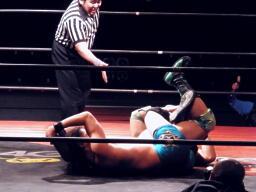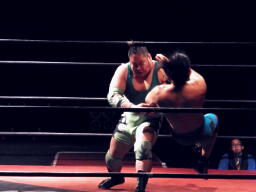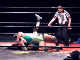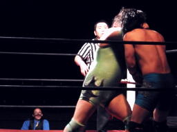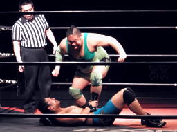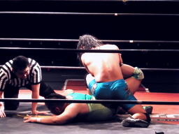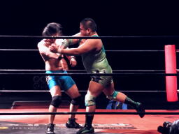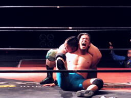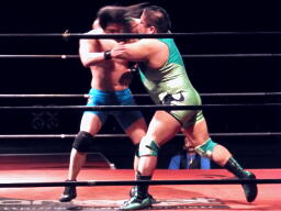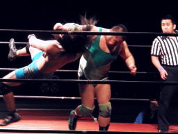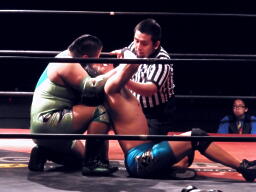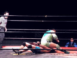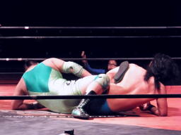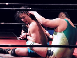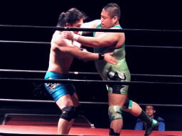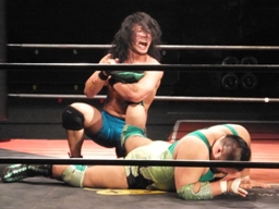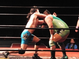 ロックアップ、入江がロープに押し込む、ブレーク。彰人腕取ってハンマーロック(左写真)、入江切り返す。彰人切り返してヘッドロック、入江カニばさみで倒しヘッドロック、彰人エビ固めに、カウント2。