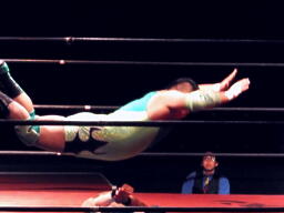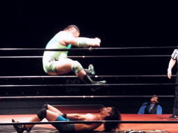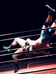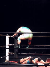 彰人スクールボーイで転がして低空ドロップキック、入江ジャンプしてかわすとそのままテディベア投下(右写真)、カウント2。