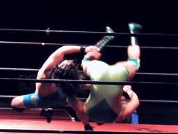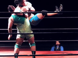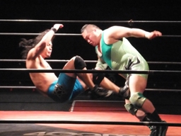 入江バックドロップ狙う、彰人ブロックしてビクトル投げ(右写真)からヒザ固め、入江ロープ。