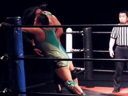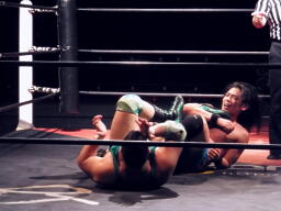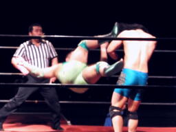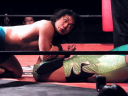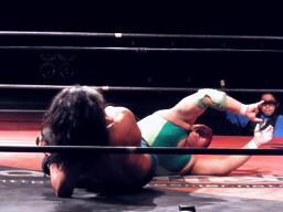 キウイロール(左写真)からアンクルホールド、さらにエビ固め、カウント2。入江エルボー、カウント2。ここでタイムアップ。