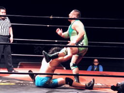 彰人ヒザにキック、T-boneスープレックス狙うが入江はブロック、逆に持ち上げてブラックホールスラム(左写真)。